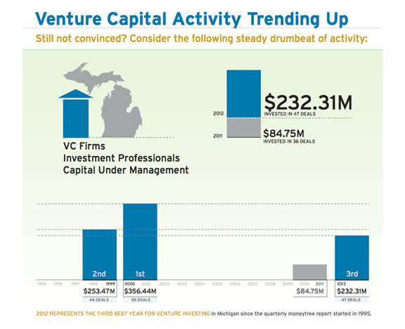 Venture capital investment in Michigan jumped to $232.3 million, up from $84.7 million in 2011, according to research from the Zell Lurie Institute for Entrepreneurial Studies at Ross. That represents the third-best year for such investment in the state since 1995. And Michigan's University Research Corridor places at or near the top of seven university innovation clusters in the United States, with a $15.5 billion economic impact statewide.